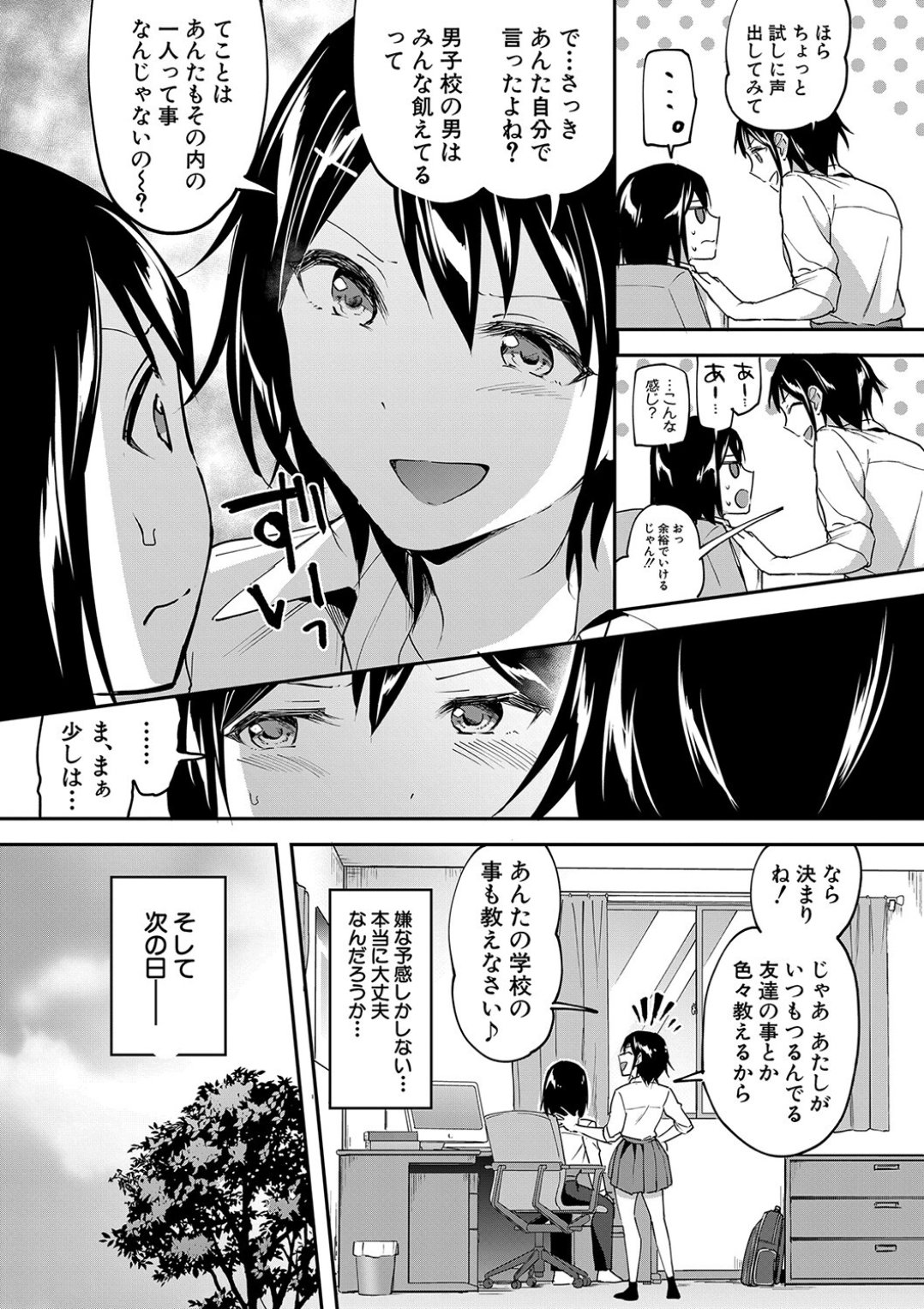 双子のJK姉の思い付きで、姉の女子校に通うことになった弟の薫。登校初日に姉の親友・由美子と友達の千里・静香とカラオケに行くことに。千里・静香が歌っている中で、由美子は薫の正体に気付いていると話す。間近で薫の顔を見つめる由美子に勃起してしまう薫。すると由美子は薫の制服のスカート越しにソレを触りだして──。