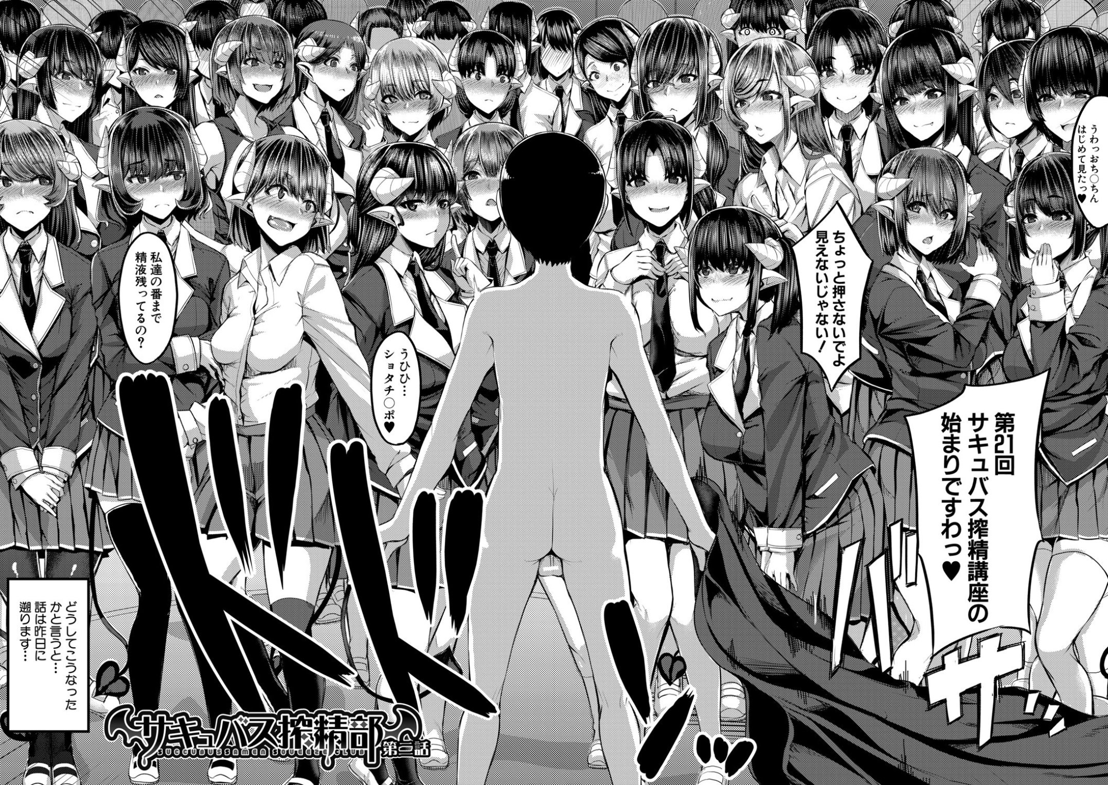 サキュバスと人間が共に学ぶ咲蓮学園で創設された「サキュバス搾精部」。部唯一の男子搾精係に任命された一年生の千鳥歩だが、女子部員が部費を使い過ぎ底を尽いてしまった。そこで搾精部伝統の「サキュバス搾精講座」を開催することに。体育館に集まった数百人の処女JKサキュバスたち。彼女たちの目的は、歩との行為を通じ有料で「正しい搾精」を学ぶことで──。