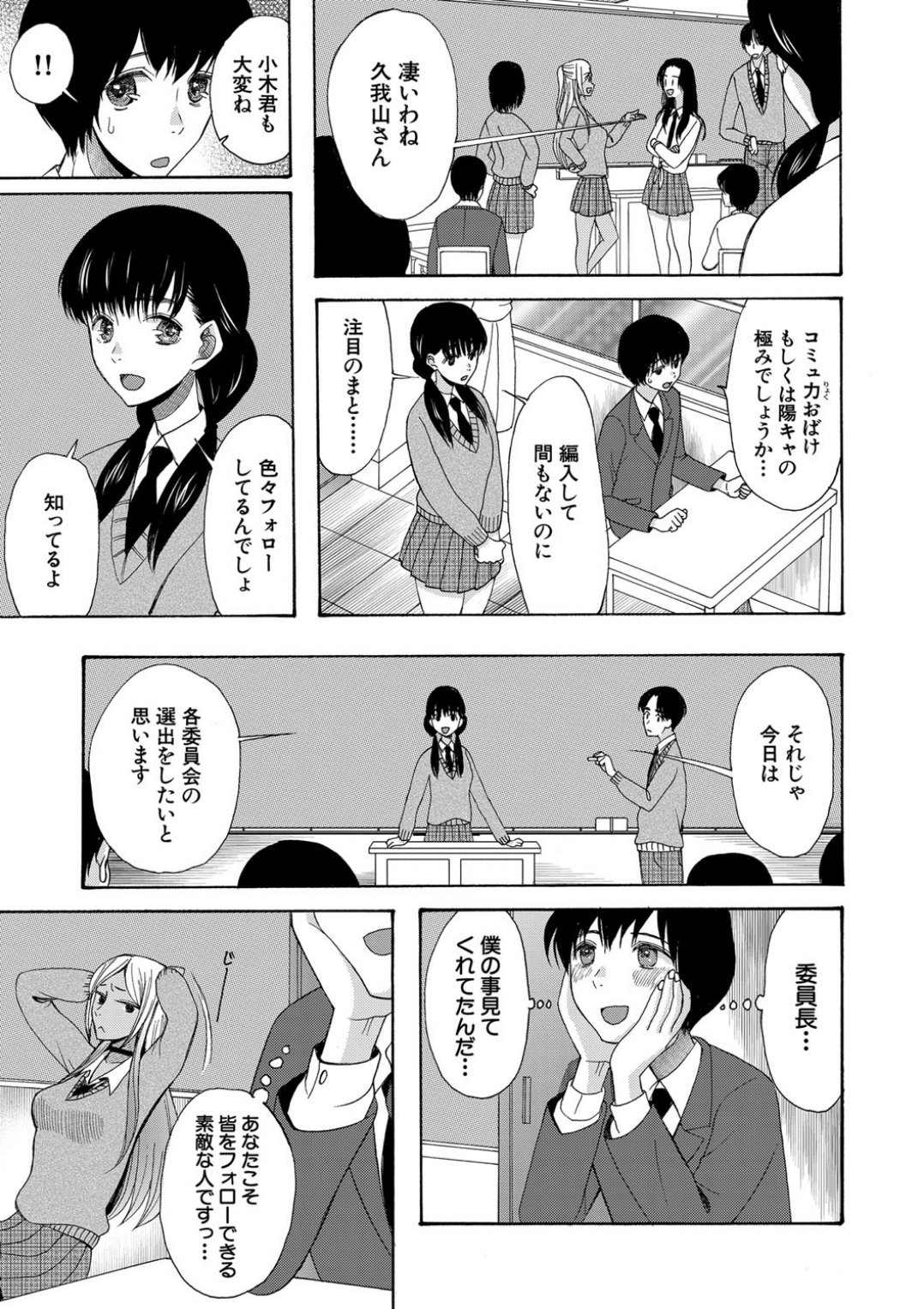 転校生の黒ギャルJ○・久我山蘭が隣の席になった善直。大きな声に射るような目、自分より背が高く距離感がやたら近い。義直の最悪な印象とは裏腹に、瞬時にクラスに溶け込んでいく彼女。そんなある日、義直は蘭と同じ保健委員に所属することに。委員の仕事を終えた2人が教室に向かうと、妙な声がすることに気付く。中を覗くと、善直が想いを寄せる委員長が担任と交わっていて──。