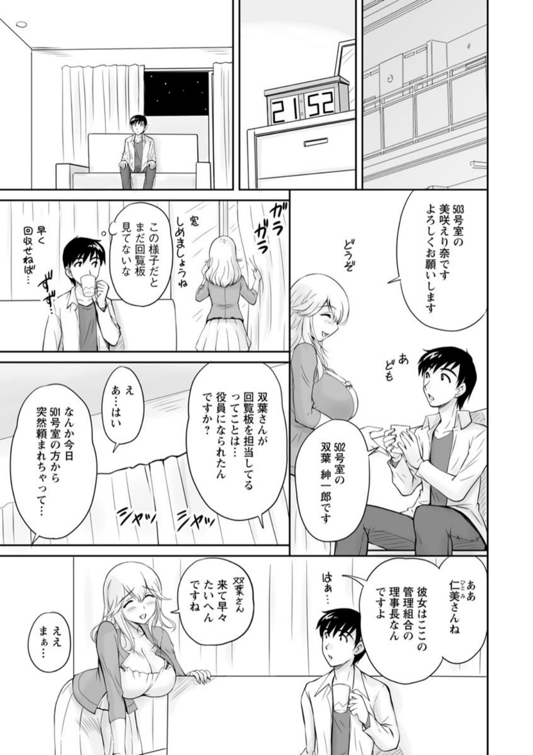 趣味で書いてたエロ小説がバレて、結婚直前に婚約破棄された主人公。そんなある日、新居として購入したマンションで、隣に住むセミロングでおっとり系の巨乳団地妻・えり奈と出会う。「お時間よろしければあがっていきませんか?」誘われるまま部屋のソファに腰を下ろすと、彼女はそっと身体を寄せてくる。「うちの主人・・・出張ばかりで今日もいないの・・・」そう囁くと、ゆっくりと手を伸ばして誘惑し──。