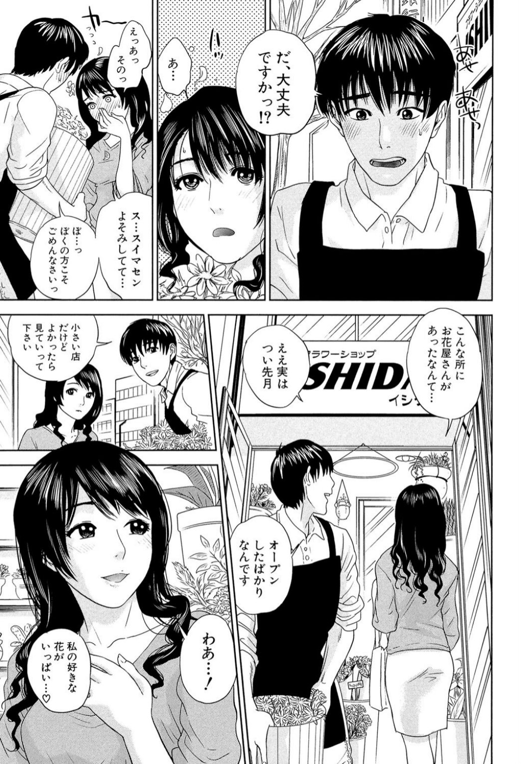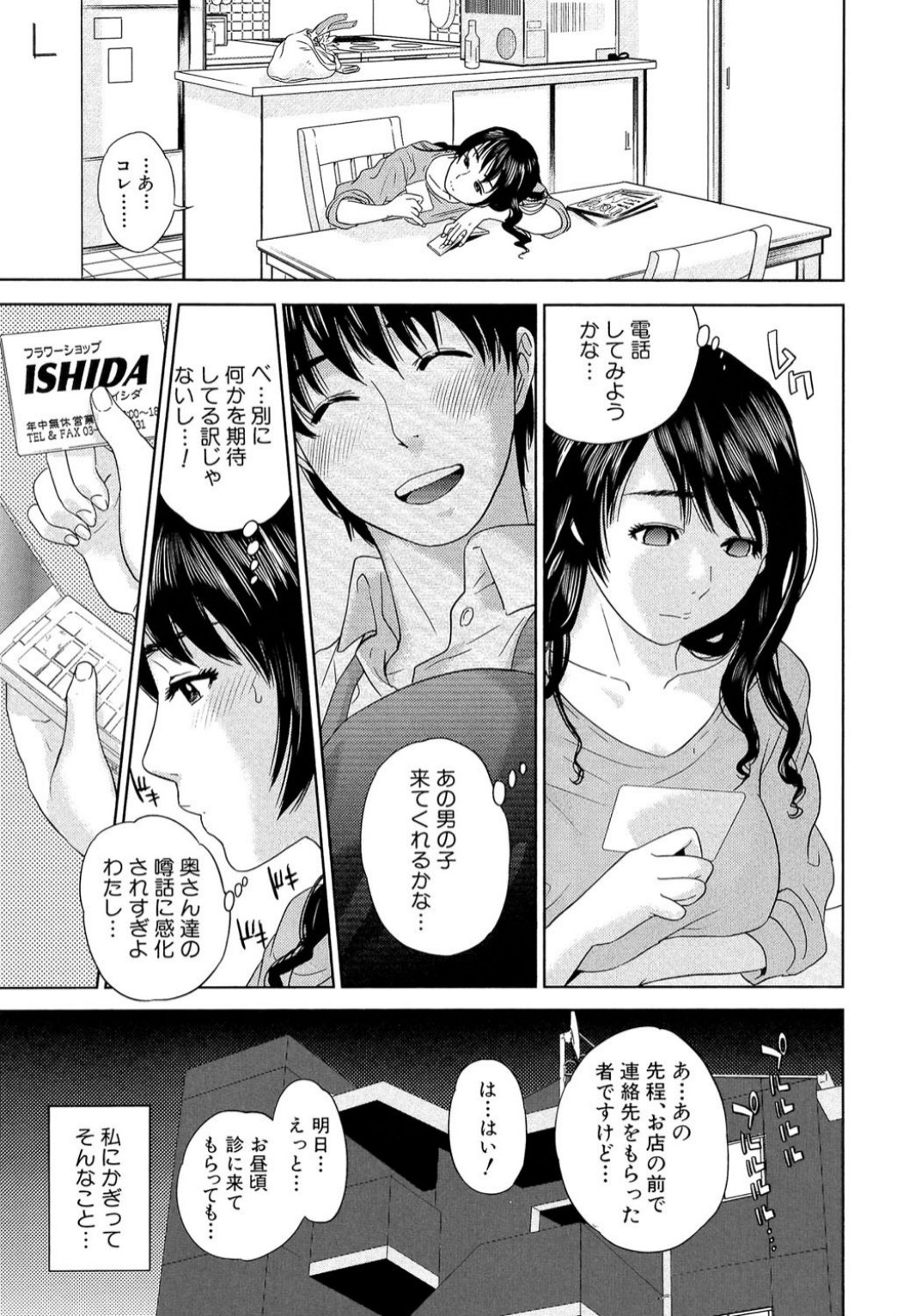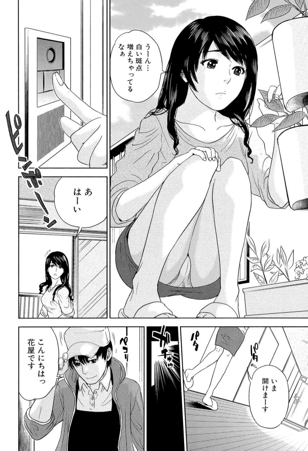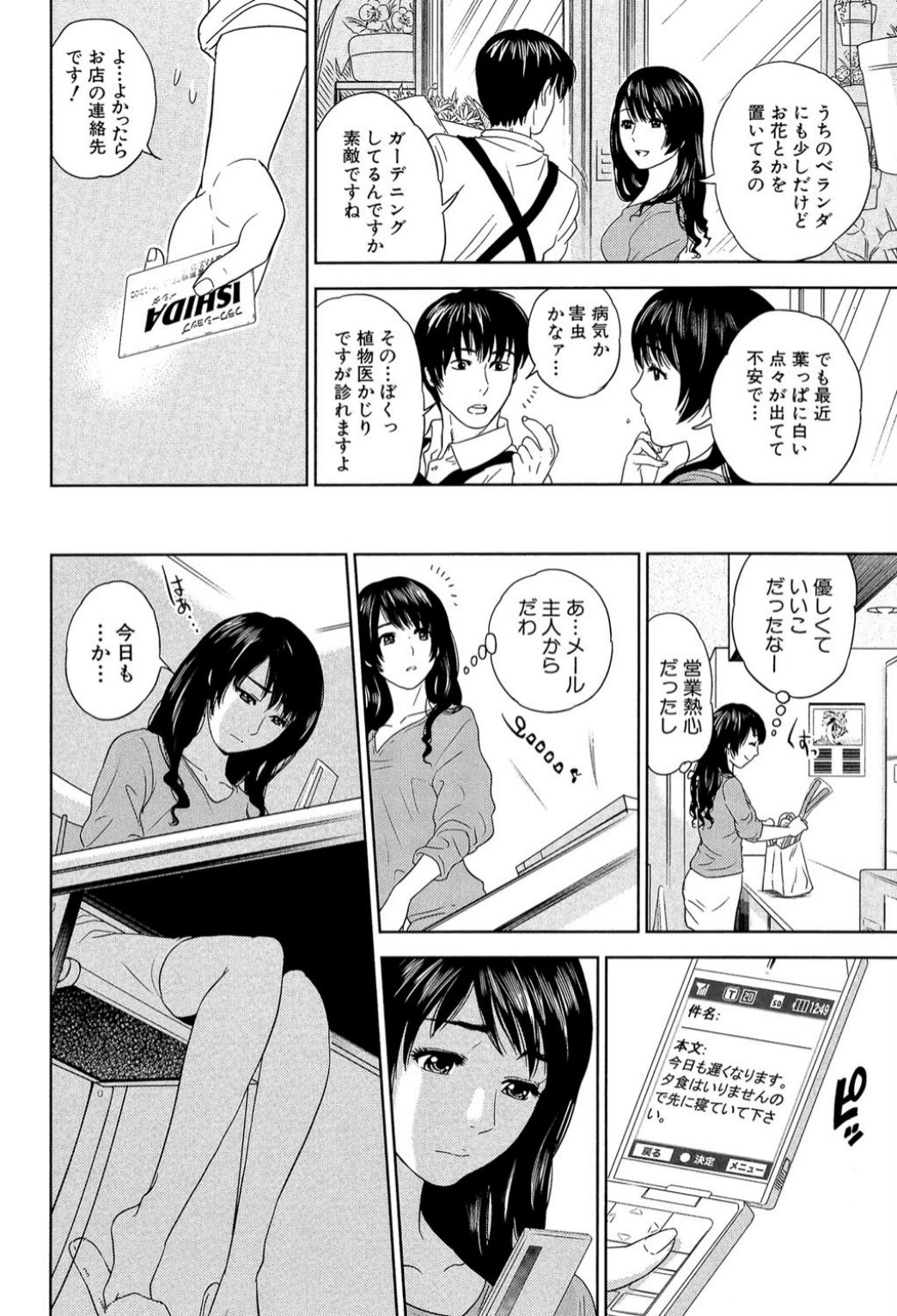 恋愛経験ゼロでお見合い結婚した、黒髪ロングヘアで清楚系の専業主婦。ある日、近所で花屋を営む年下男性と出会い、純朴で仕事熱心な彼に好感を抱く。夫に相手にされず寂しさを感じていた彼女は、ベランダの植物を見てもらう口実で自宅マンションに彼を招く。無防備な格好でバルコニーに出た彼女に、花屋の視線が向けられて──。