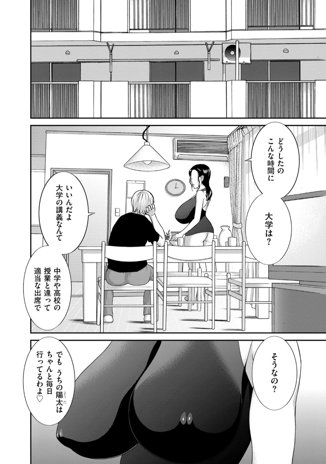 黒髪セミロングで爆乳巨尻の子持ち人妻・秋江。買い物から帰る彼女を待っていたのは、大人になった息子の友達・圭二。子どもの頃から知っている彼は、秋江にとってもう一人の息子のような存在だった。失恋した圭二に、“いつものやつ”で慰めて欲しいと頼まれた彼女は、自宅マンションの寝室に彼を招き入れる。二人には誰にも言えない秘密の“慰めルーティン”があって──。