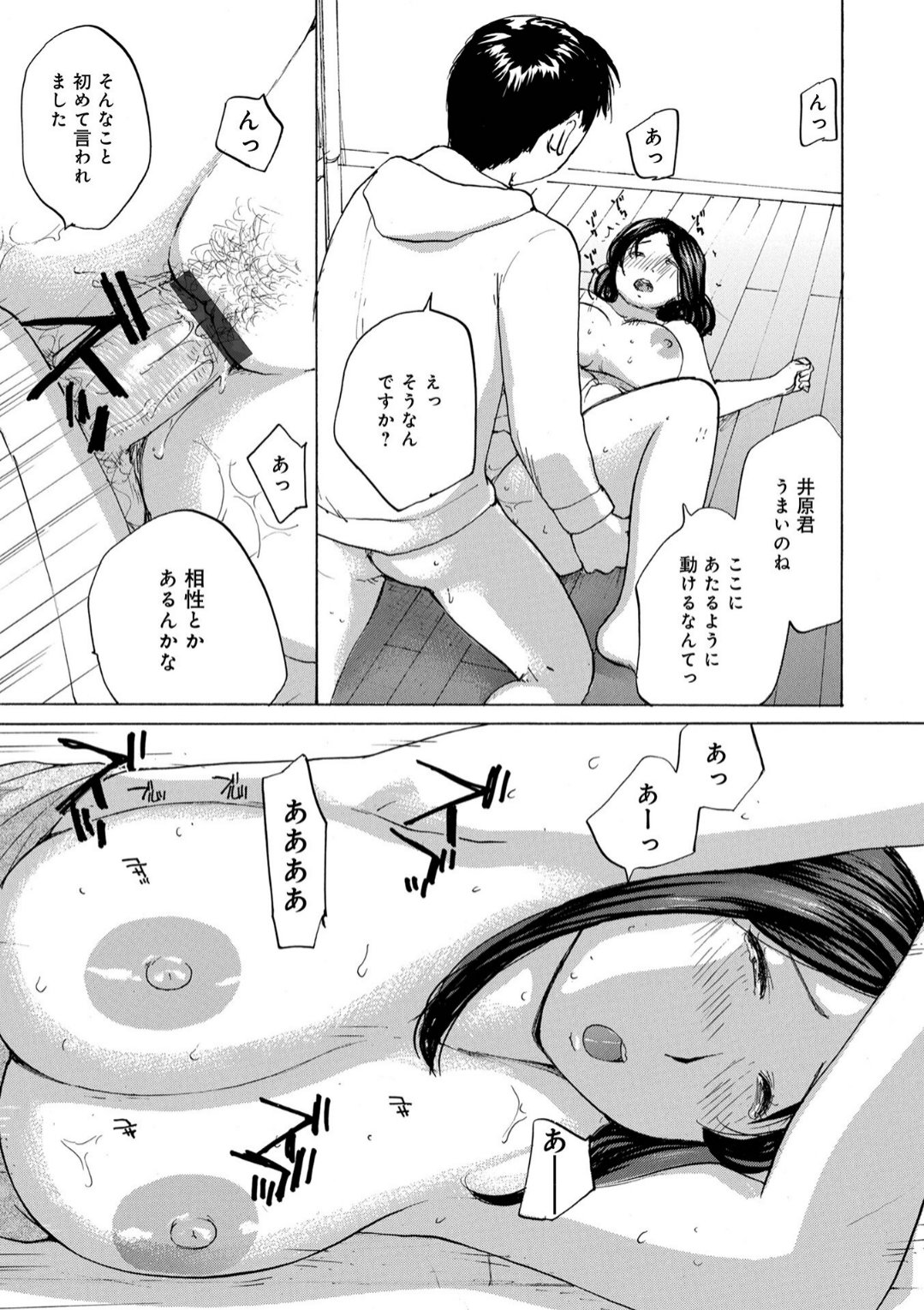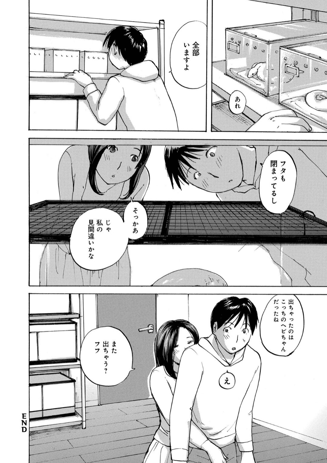 大学時代のサークルで先輩だった黒髪セミロングの爆乳人妻に呼び出された主人公。旦那の留守中に頼まれたペットのヘビの世話の仕方が分からないと言う。「ここ・・・暑いでしょ?」ペット部屋で上着を脱いでノーブラにキャミソール姿になった先輩に、主人公は思わず見とれてしまう。すると彼女は電気を消して──。
