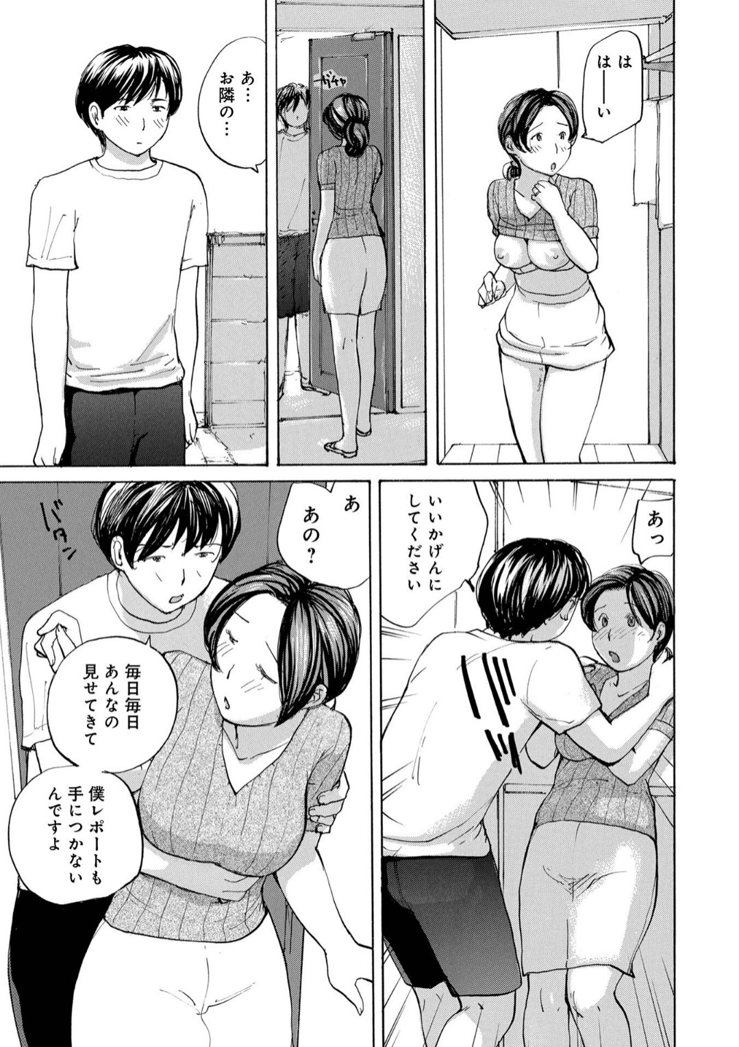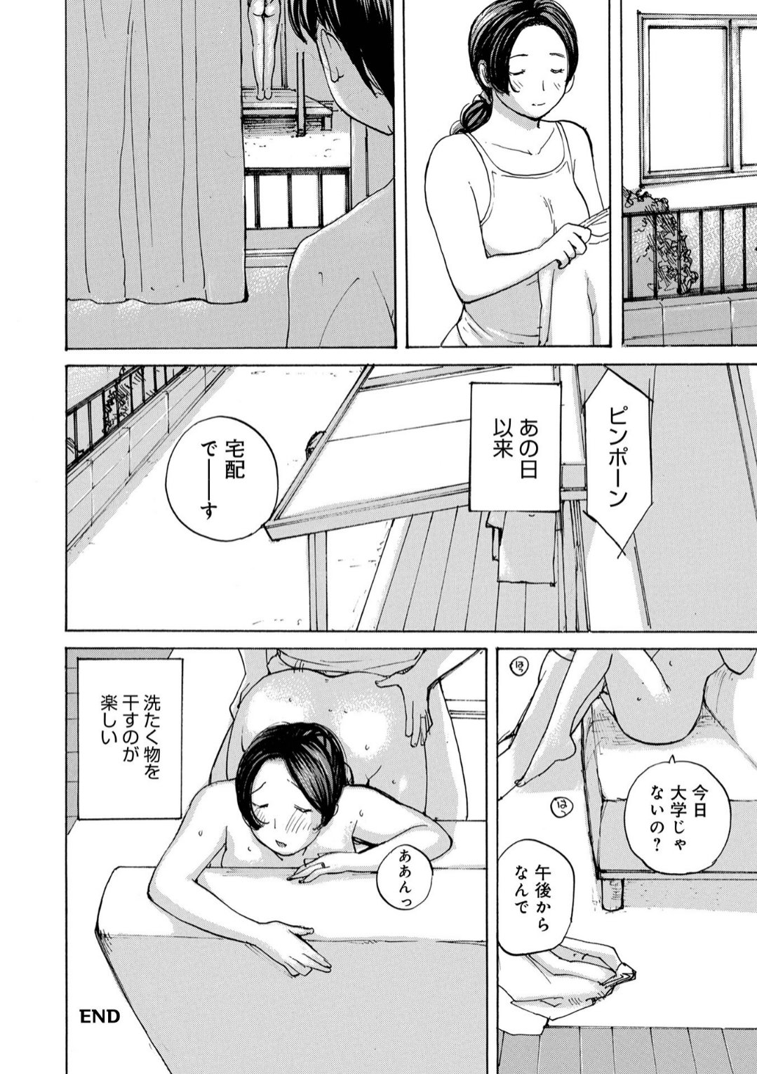 半裸で洗濯ものを干す黒髪おさげの巨乳専業主婦。「今日も私のこと見てる・・・」平凡な日常の中で、隣人の若い男に裸をのぞかせて誘惑するのが密かな楽しみになっていた。興奮した彼女は、おっぱいを露出しオナニーまで始めてしまう。インターホンが鳴り玄関へ向かうと、そこには隣人が立っていて──。