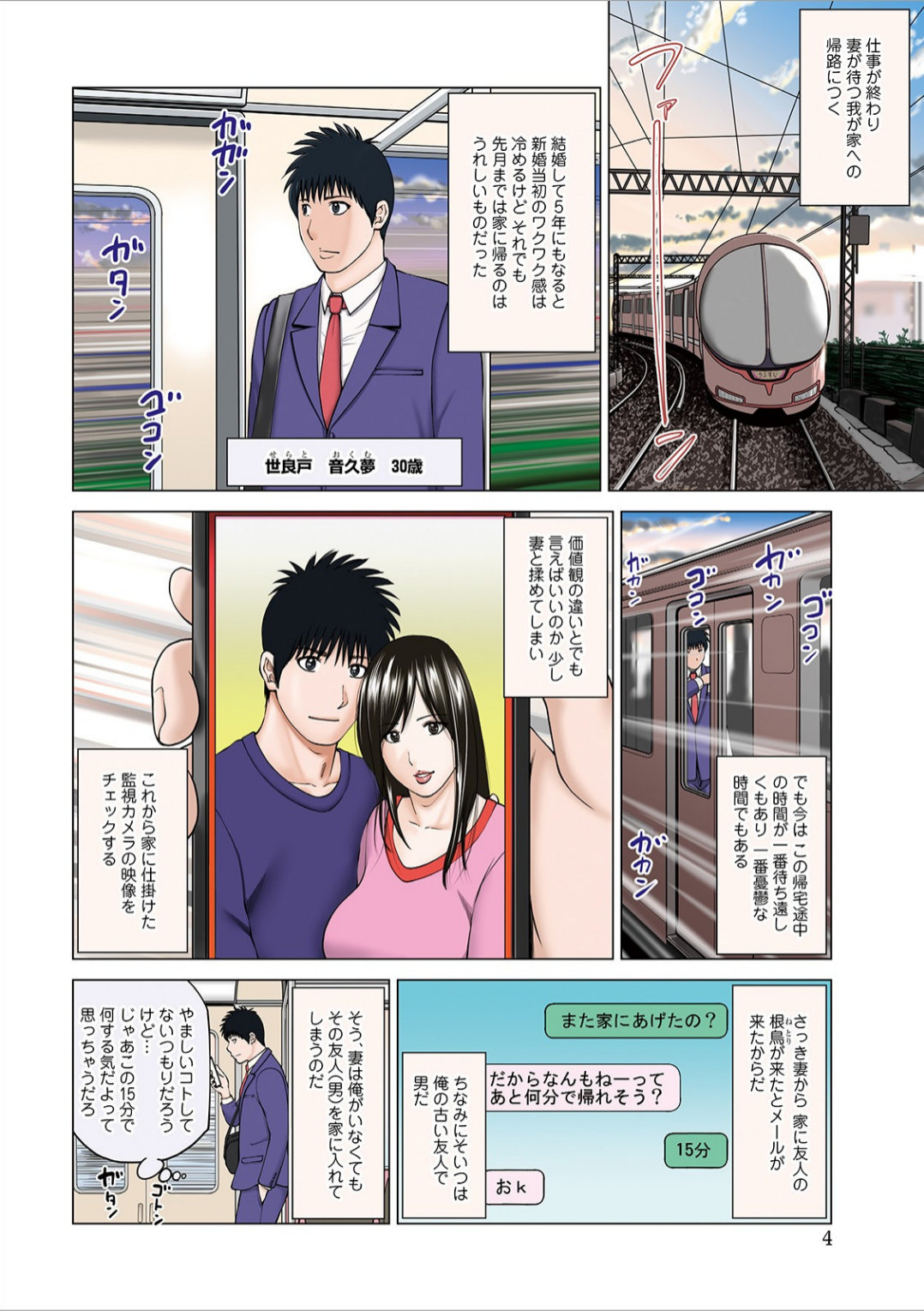 妻の不倫を疑いリビングの隠しカメラで監視する主人公。電車の中で確認すると、そこには黒髪ロングヘアのアラサー巨乳人妻と友人のキスする姿が。帰宅する主人公を何食わぬ顔で迎える二人。自分の知らない場所で情事に耽る光景を想像するうちに、主人公は嫉妬と同時に未経験の興奮に飲み込まれていき──。