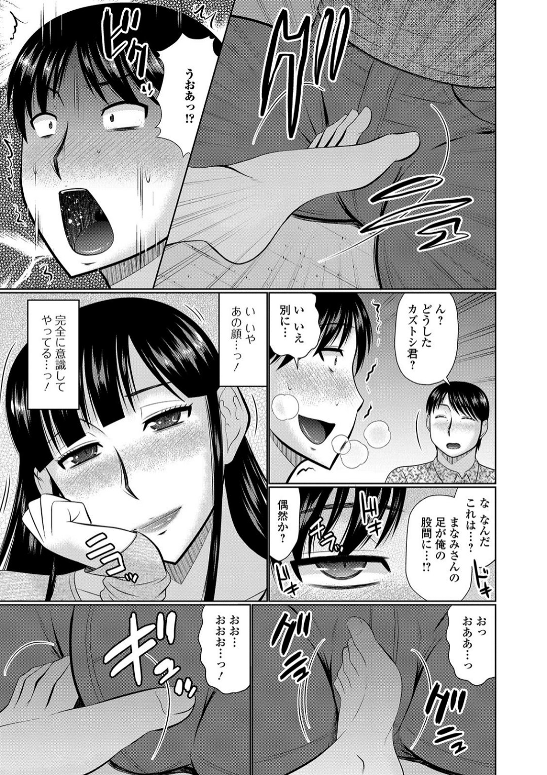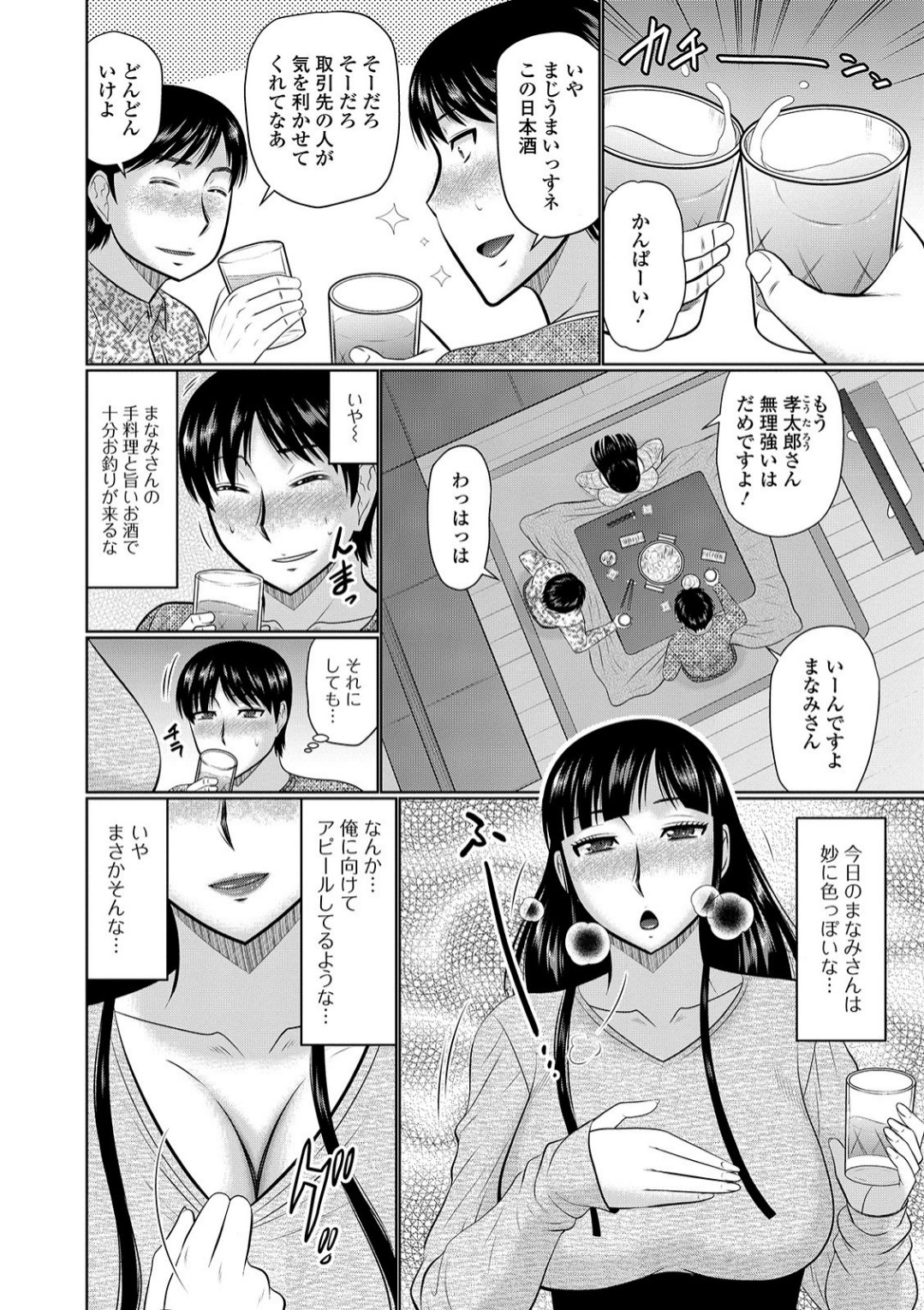 上司の家に度々招かれる主人公は、黒髪ロングヘアの巨乳人妻・まなみに密かに惹かれていた。ある日、リビングのコタツ越しに足で股間を弄び誘惑してくるまなみ。「最近は仕事が忙しくて・・・夜のほうが全然駄目なの・・・」夫が酔い潰れて寝落ちすると、抑えていた淫乱な本性を剥き出しにして──。