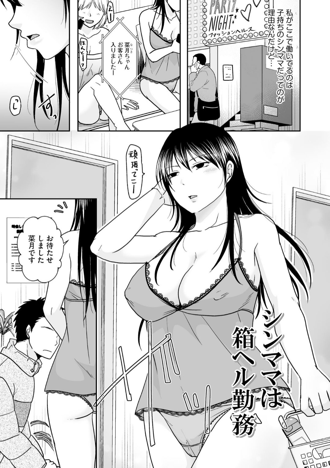 箱ヘル風俗嬢として働く黒髪ロングヘアの巨乳シングルマザー・菜月。プレイ部屋に向かうと、どこか見覚えのある客が待っていた。「お名前なんて呼べばいいですかー?」気付かぬフリで尋ねると、子ども関係の知り合いと判明。「気づいてる!?気づいてない!?」菜月は動揺を隠しながら素股プレイを始めるが──。