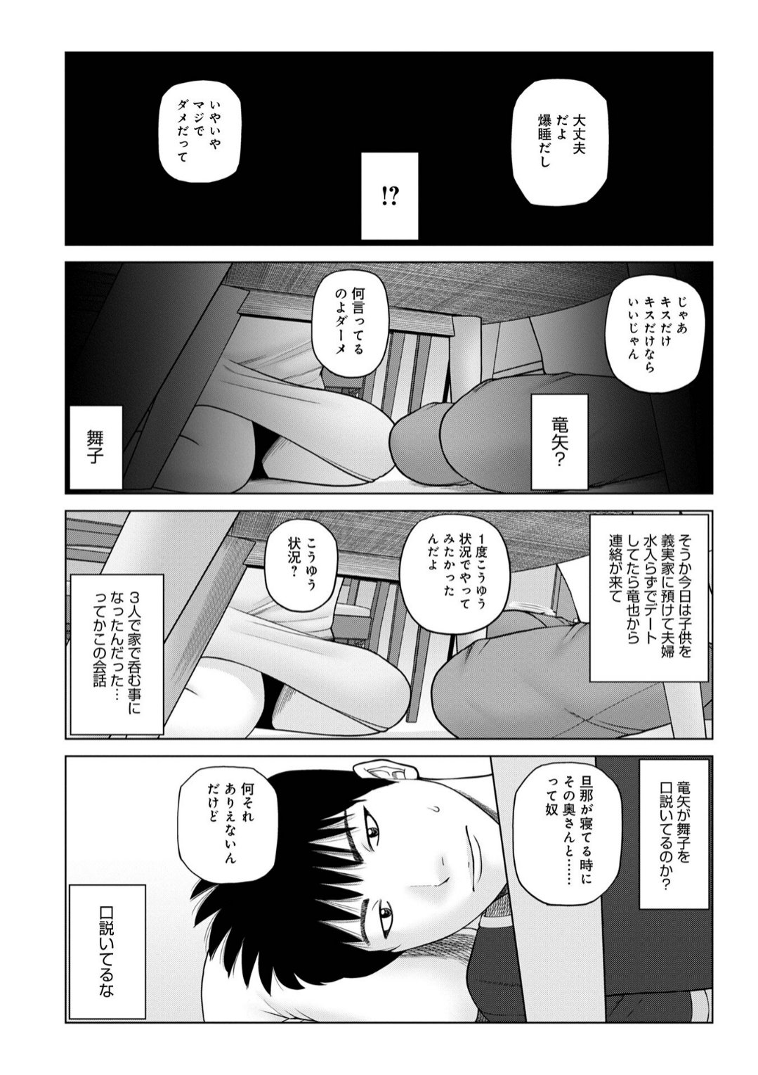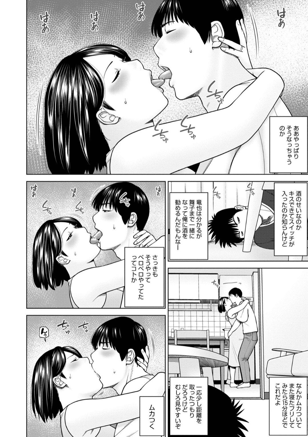 夫とその友人を交えて宅飲みするワンピース姿で黒髪ボブカットの人妻・舞子。リビングで寝落ちした夫がふと目を覚ますと、眼前には嫁と友人のキスする姿が。「マジか?ウソだろ?」寝たフリをして見ていると、二人はそのまま先へ進んでいき──。