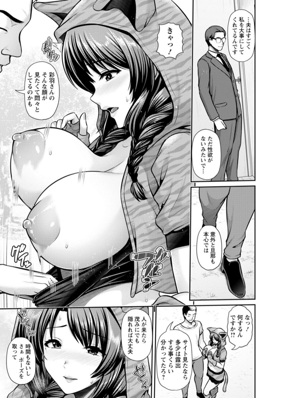 茶髪三つ編みに泣きぼくろが色っぽい、爆乳巨尻でムチムチ体型の専業主婦・彩羽。結婚して三年、幸せな生活を送るが、夫があまり抱いてくれないのが悩みの種。「せめてドキドキするようなスリルが欲しい・・・」そんな気持ちを発散するため、夫の出張中にバニーガール姿で接客するバーの裏バイトを開始。ある日、寝落ちした客をひざまくらするうちに、セックスレスで欲求不満な身体が疼き出す。「少しくらい触ってもバレないわよね・・・」彼女は客に手コキを始めて──。
