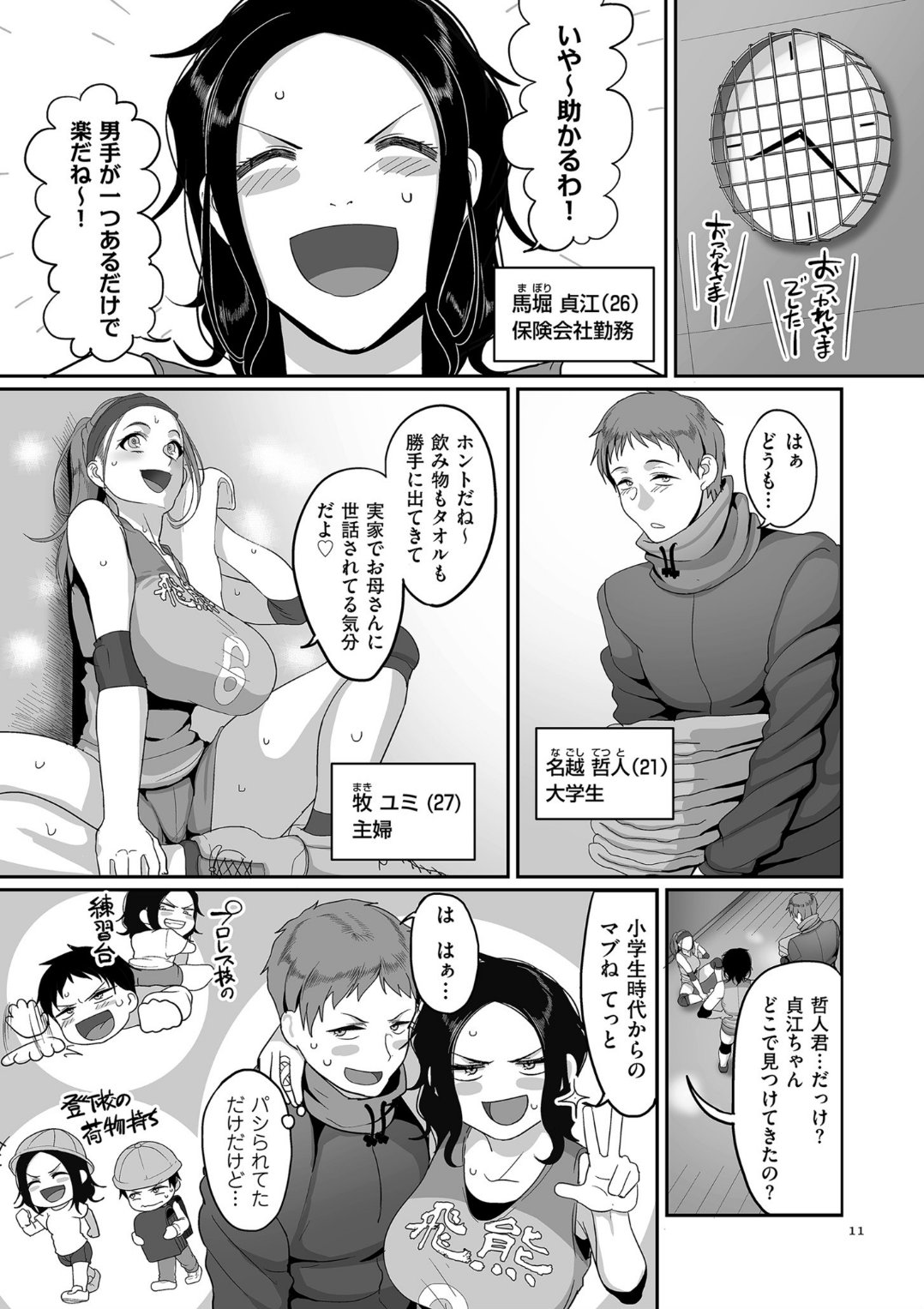 黒髪ボブカットで爆乳のアラサー幼馴染・貞江。彼女に頼まれて女子バレーボールサークルのマネージャーを始めた哲人は、人妻やOLのメンバーたちに歓迎されるが、バイト代はなくタダ働き。そんなある日、体育館の更衣室で着替え中に、“タダ働きの埋め合わせ”と称して貞江に背中から胸を押し付られる。やり返そうと哲人が抱き寄せると、彼女は抵抗することなく唇を重ねて──。